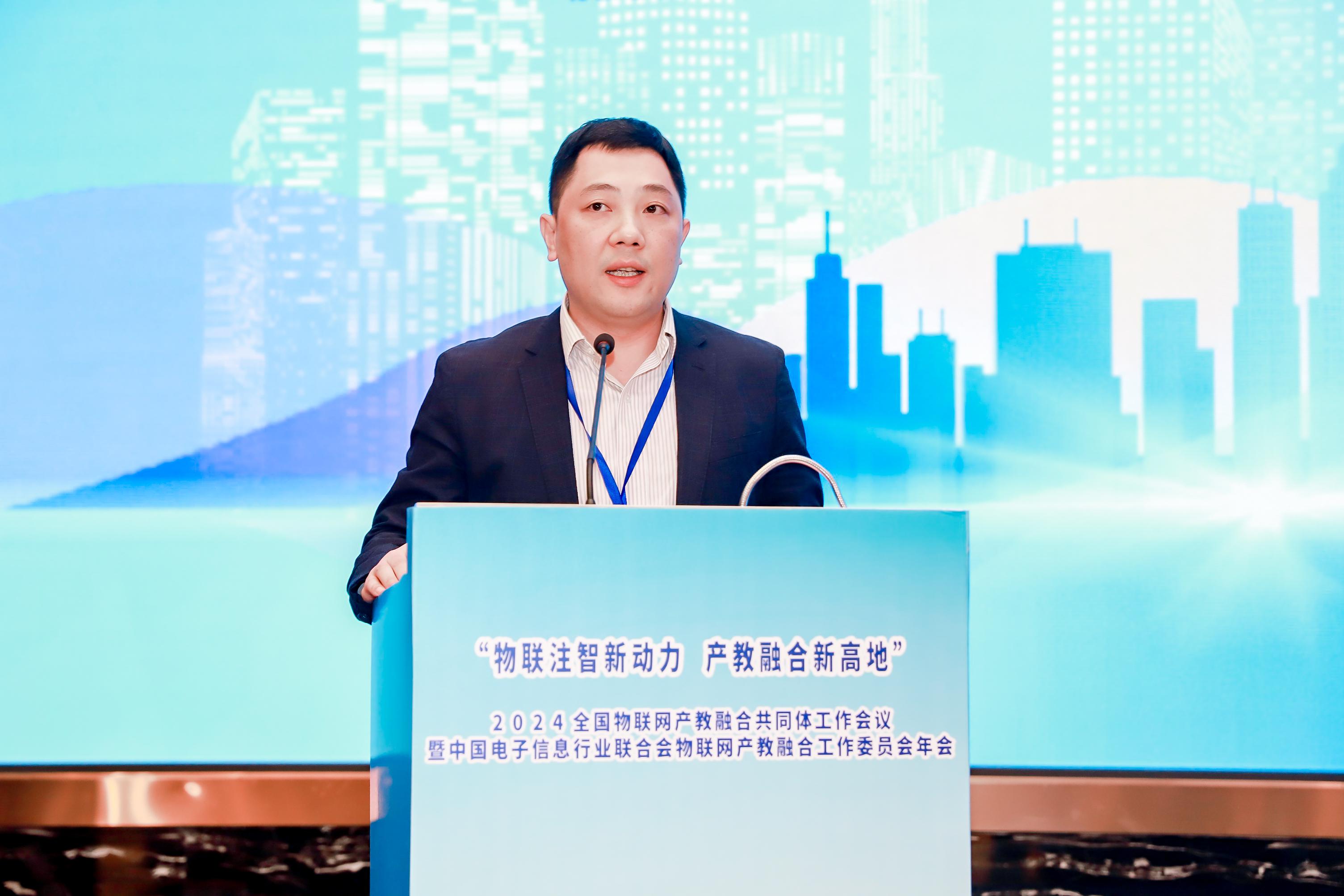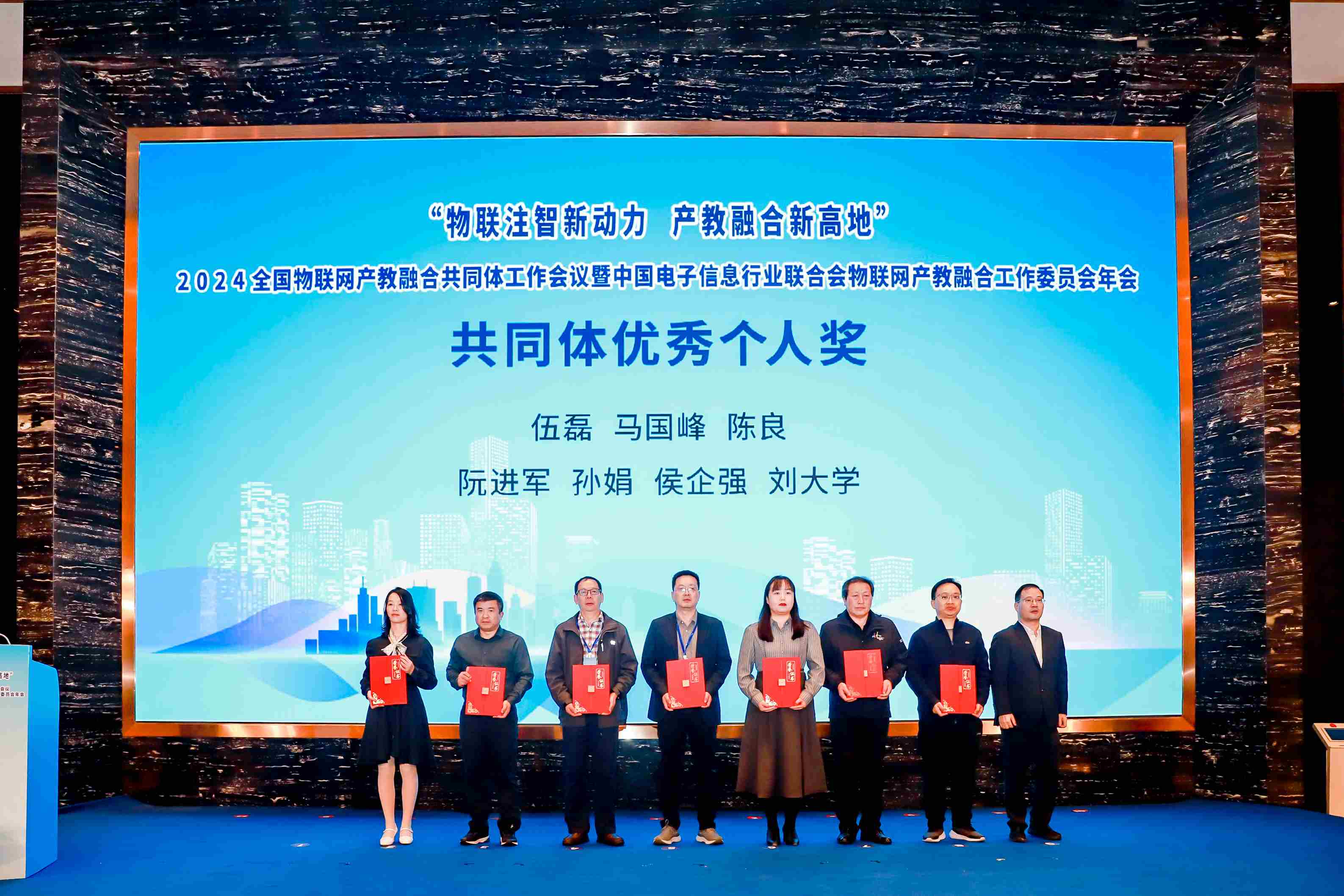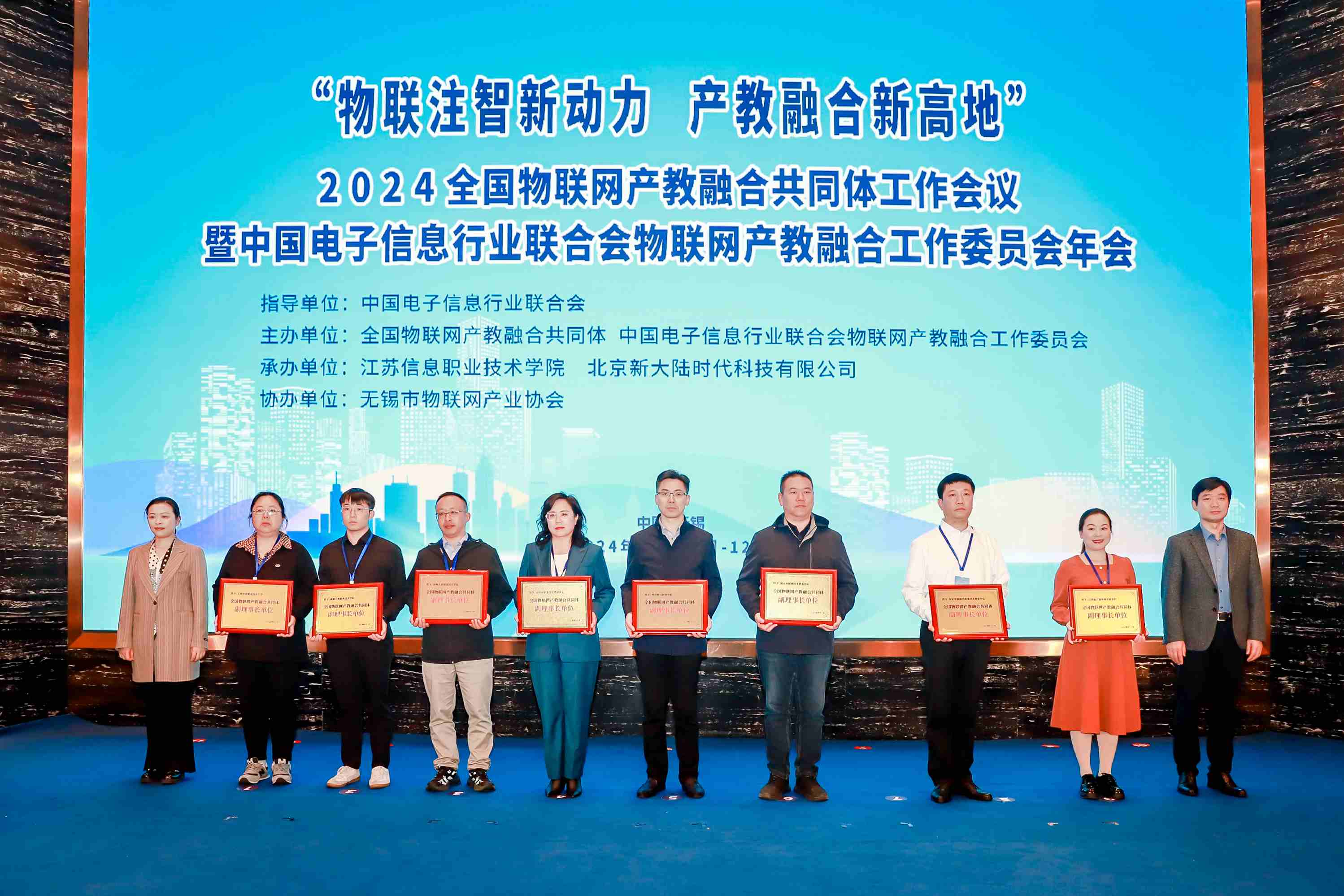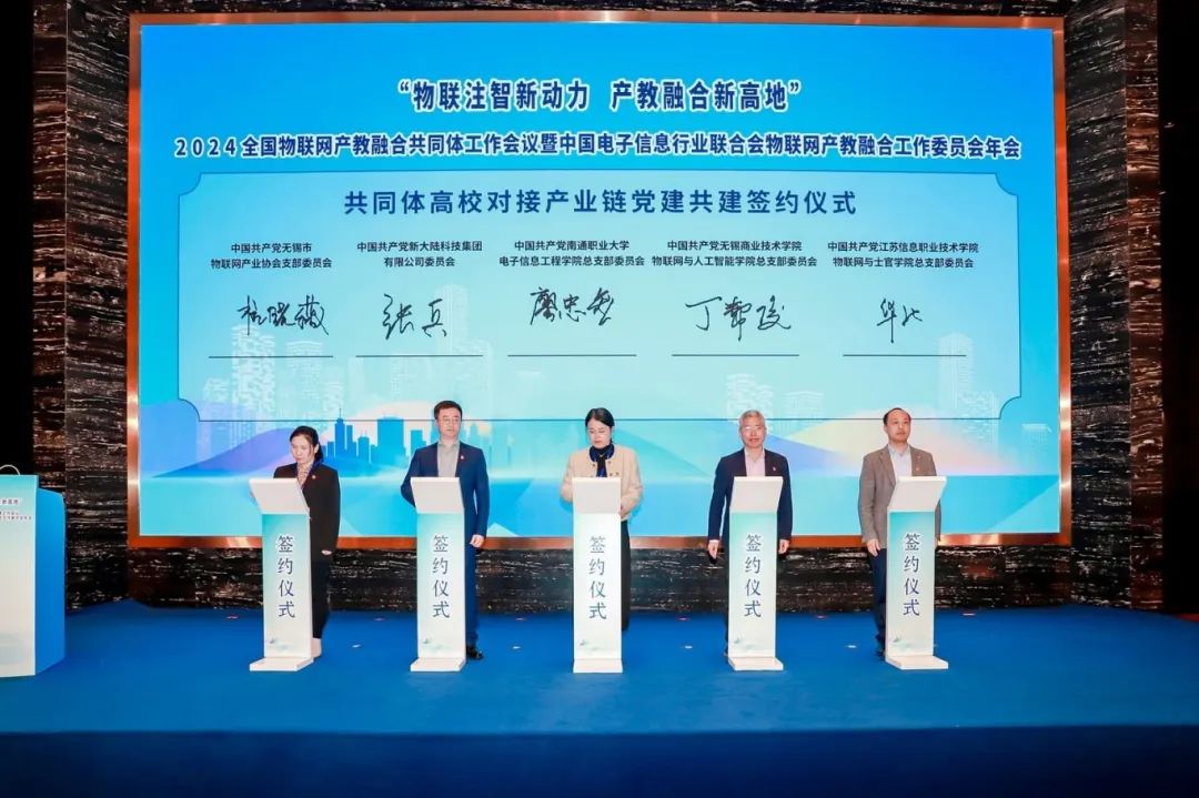 ???會上舉行了全國物聯網產教融合共同體高校對接產業鏈黨建共建簽約儀式。共同體成員單位:無錫市物聯網產業協會、新大陸科技集團、南通職業大學、無錫商業職業技術學院、江蘇信息職業技術學院五個黨總支代表共同簽約。大會還舉行了全國物聯網產教融合共同體優秀成員頒獎儀式、新成員授牌儀式、全國物聯網產教融合共同體產教供需平臺發布以及無錫物聯網產業學院成立儀式。中國電子信息行業聯合會物聯網產教融合工作委員會秘書長、江蘇信息職業技術學院物聯網工程學院院長季云峰作全國物聯網產教融合共同體和物聯網產教融合工作委員會2024年總結和2025年計劃的報告。