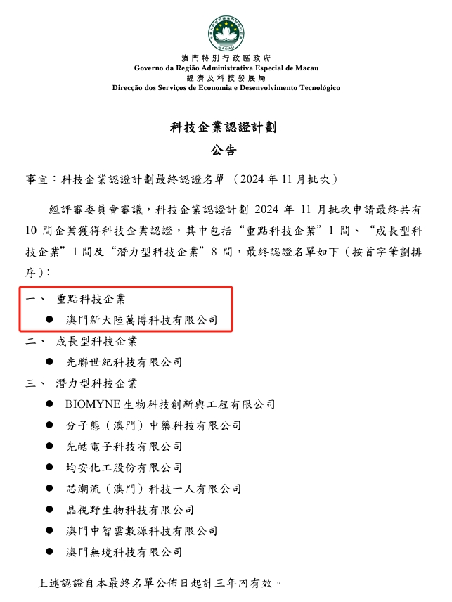 近日,澳門特別行政區政府公布新一批“科技企業認證計劃”獲認證企業名單。新大陸科技集團全球化布局的重要子公司——澳門新大陸萬博科技,憑借卓越的技術實力、創新能力和市場表現成功獲得“重點科技企業”認證,躋身澳門僅六家"重點科技企業"行列。