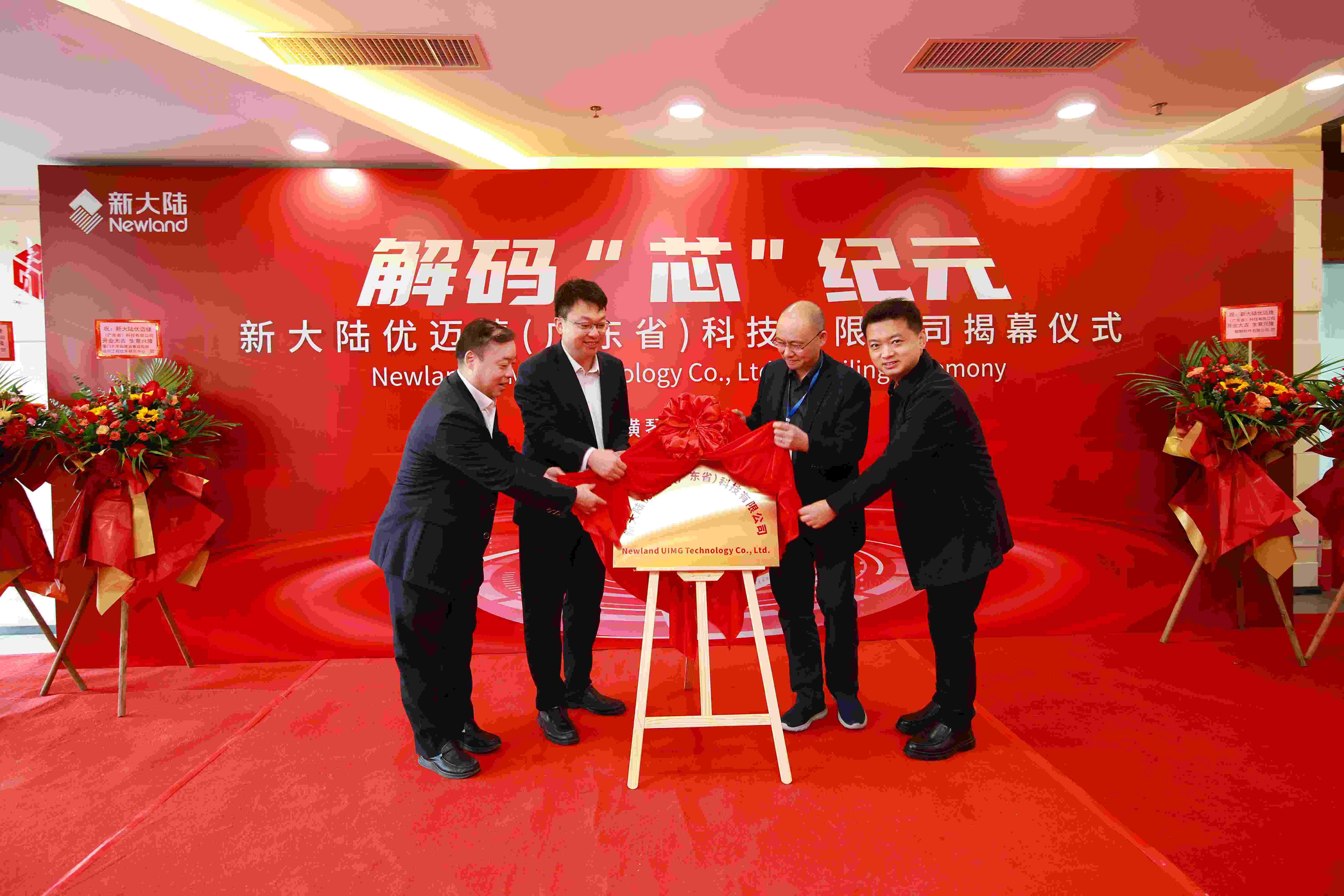 在莊重而熱烈的氣氛中,新大陸優邁捷公司董事長郭棟與嘉賓們共同揭開公司牌匾上的紅布,象征著新大陸優邁捷正式開啟新的篇章。