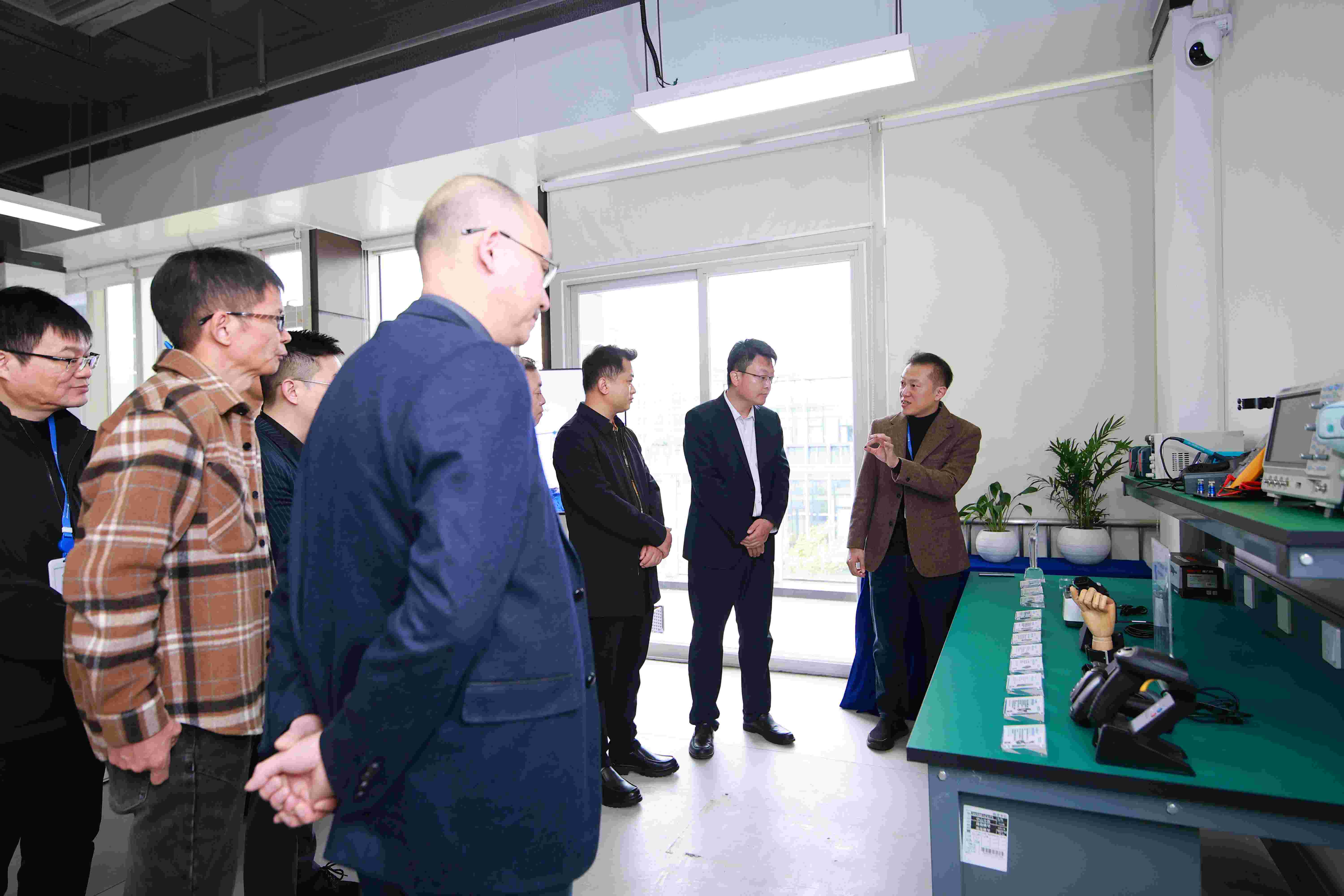 ▲在新落成的新大陸優邁捷辦公場地內,展示了多款自主研發的產品;新大陸優邁捷公司總經理郭鋒(右一)向來訪嘉賓介紹公司產品及技術