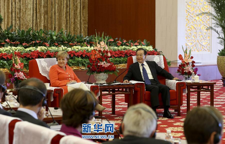 2012年8月31日,中國國務(wù)院總理溫家寶在天津同德國總理默克爾一起與兩國企業(yè)家座談。