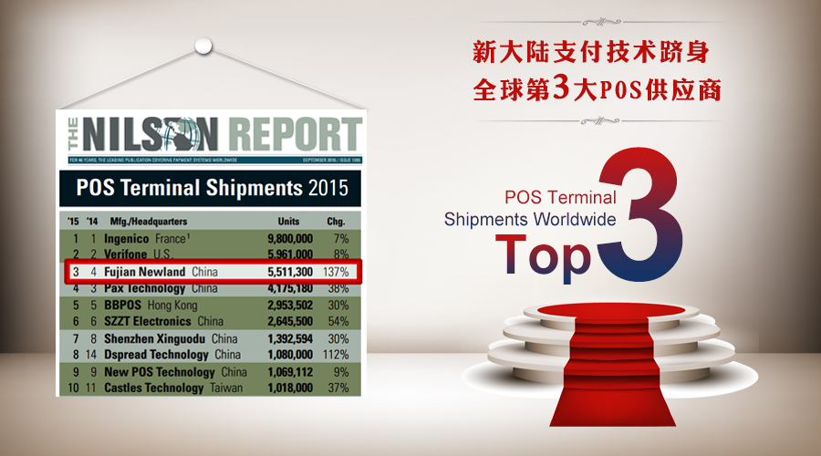 近日,全球第三方權(quán)威數(shù)據(jù)研究機(jī)構(gòu)尼爾森發(fā)布了《2015年全球POS供應(yīng)商排行》,新大陸支付技術(shù)公司以137%的增幅,躍居全球第三大POS供應(yīng)商,并居亞太地區(qū)榜首。全球市場(chǎng)占有率達(dá)12.66% 。