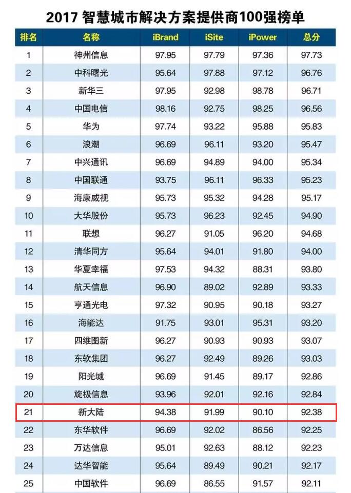 《2017智慧城市解決方案提供商100強榜單》日前對外公布,新大陸以總分92.38位居第21位。該榜單由《互聯網周刊》和eNET研究院聯合推出。