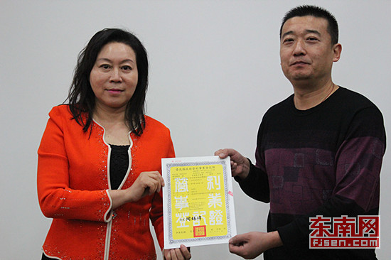 新大陸科技集團(tuán)總裁王晶(左)向國家博物館藏品保管二部征集室副主任吳華良捐贈(zèng)“臺(tái)北縣政府營利事業(yè)登記證”